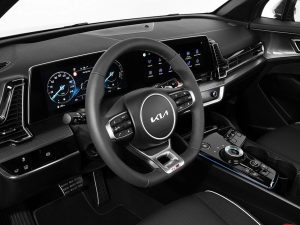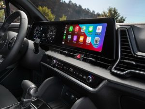 KIA Sportage Hybrid mới sử dụng màn hình giải trí 12,3 inch cho phép kết nối với điện thoại thông minh qua Apple CarPlay/Android Auto. Đầu ra của hệ thống giải trí trên Sportage là dàn âm thanh vòm Harman Kardon có công suất 320W.